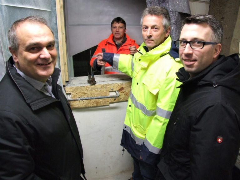 Ortstermin in Böhne (von links): Bürgermeister Klaus Gier, Hartmut Emde, Helmut Hauer und Alexander Paul besichtigten den Baufortschritt in der Vorkammer des Hochbehälters. (Foto: Klein)