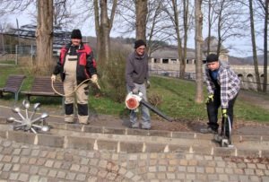 Großreinemachen an der Sperrmauer: Heinrich Hahn, Jurij Moser und Praktikant Pascal Simon (von links) beim Säubern des Aquaparks. (Foto: Klein)