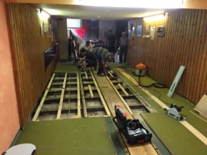 Baustelle Kegelbahn (von links): Werner Staab, Philipp Witte, Christian Schaub, Günther Bott, Moritz Dorn, Bernd Stobrawa beim „Zerlegen“ des Schwingbodens. Auf dem Bild fehlen: Jan Friderritzi, Andreas Happich, Christian Boilich und Rüdiger Milisterfer. (Foto: pr)