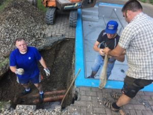 Mit nicht minderem Eifer ging es an der Wassertretanlage weiter. Auch hier schufteten zahlreiche Freiwillige bei der Instandsetzung in Zusammenarbeit mit Helmut Hauer, Wassermeister der Nationalparkgemeinde Edertal. Ein Absperrschieber musste von ihm ausgetauscht und erneuert werden, den Wechsel eines defekten Abflussrohres erledigten die Ehrenamtlichen selbst. Zuvor galt es für sie eine Baugrube in teilweise mühevoller Handarbeit und mit Einsatz eines Minibaggers auszuheben, die anschließend wieder zu geschippt wurde. Nachdem dies erledigt war, ging es an das Anfüllen mit Mutterboden, das Neuverlegen von Pflastersteinen und das Abdichten des großen Beckens mit einer speziellen Dichtmasse. „Am Ende sind auch hier 40 Arbeitsstunden zusammengekommen“, erzählt Heide Witte.