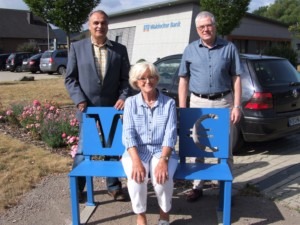 Eine Sitzgelegenheit im Gewerbegebiet von Giflitz vorgestellt (von links): Bürgermeister Klaus Gier, Gemeindevorstandsmitglied Annegret Schultze-Ueberhorst und Geschäftsstellenleiter Bernd Lückel. (Foto: Klein)