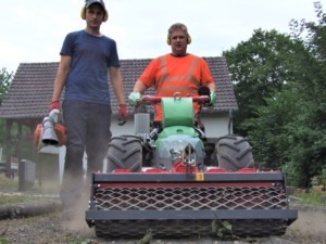 Staubige Angelegenheit: Sebastian Brindöpke (links) und Frieder Lorenz bearbeiten mit dem Pflegegerät die Wege auf dem Gelände des Friedhofs in Hemfurth. (Foto: Klein)