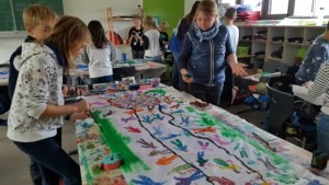 Kreativ für eine weltoffene Gesellschaft: Edertaler Grundschülerinnen- und Schüler beim Bemalen bunter Fahnen. (Foto: Julia Jespers)