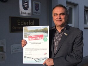 Das der Strom aus den Steckdosen aller Edertaler Bürger- und Dorfgemeinschaftshäuser, Festhallen und der anderen kommunalen Liegenschaften auch tatsächlich aus regenerativen Energiequellen stammt, wird der Nationalparkgemeinde mit einem Zertifikat der EWF bescheinigt. Das Versorgungsunternehmen teilt dazu mit: „Mit diesem Zertifikat bestätigen wir die Lieferung elektrischer Energie aus 100 Prozent Ökostrom aus zum Beispiel nachhaltigen Wasserkraftanlagen mit modernen Umweltstandards die an das europäische Stromnetz angeschlossen sind. Die Ökostrom-Herkunftsnachweise entsprechen den Kriterienkatalog Ökostrom RE der Klimainvest Green Concepts GmbH. Die Bilanzierung und Entwertung der Herkunftsnachweise erfolgt über das Herkunftsnachweisregister (HKNR) beim Bundesumweltamt.“ Bürgermeister Klaus Gier ist überzeugt: „Das ist eine gute Sache auch zum Nutzen unserer Region. Denn von jeder verbrauchten Kilowattstunde EWF Naturstrom fließt ein Beitrag in die Förderinitiative ‚Kids for Nature‘, mit der die EWF Naturschutz- und Energiesparprojekte von Kindern und Jugendlichen unterstützt.“