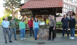 Amtsübergabe am Dorfbrunnen in Königshagen (von links): Harmut Eigenbrodt, André Wüstenberg, Nadja Keil, Andreas Pockrandt, Janina Eigenbrodt, ihr Vorgänger Andreas Dehnert sowie Jörg und Tanja Schweitzer. (Foto: Privat)
