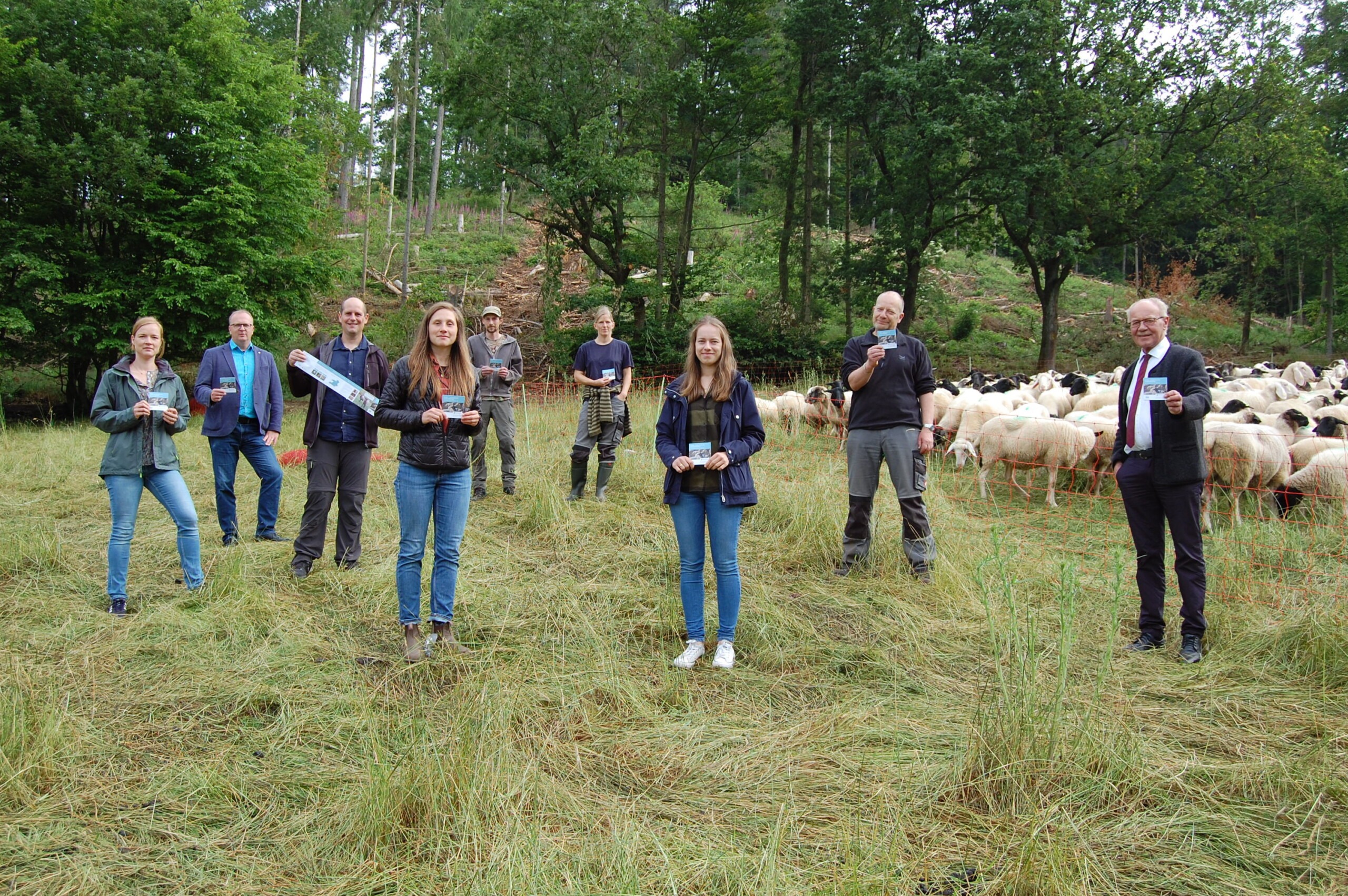 Machen auf die Notwendigkeit der Schafhaltung im Landkreis aufmerksam (von links): Kerstin Arndt (Mitarbeiterin LPV), Ralf Gutheil (Bürgermeister und Vorsitzender LPV), Carsten Müller (Geschäftsführer LPV), Jessica Albers (ehem. Projektmanagerin Ökomodellregion), Ghazal Brehl (Landwirt und Schafhalter), Daniela Braun (Landwirtin und Schafhalterin), Jacqueline Bienhaus (Mitarbeiterin LPV), Oliver Diehl (Landwirt und Schafhalter) und Dr. Reinhard Kubat (Landrat). (Foto: Landkreis Waldeck-Frankenberg)