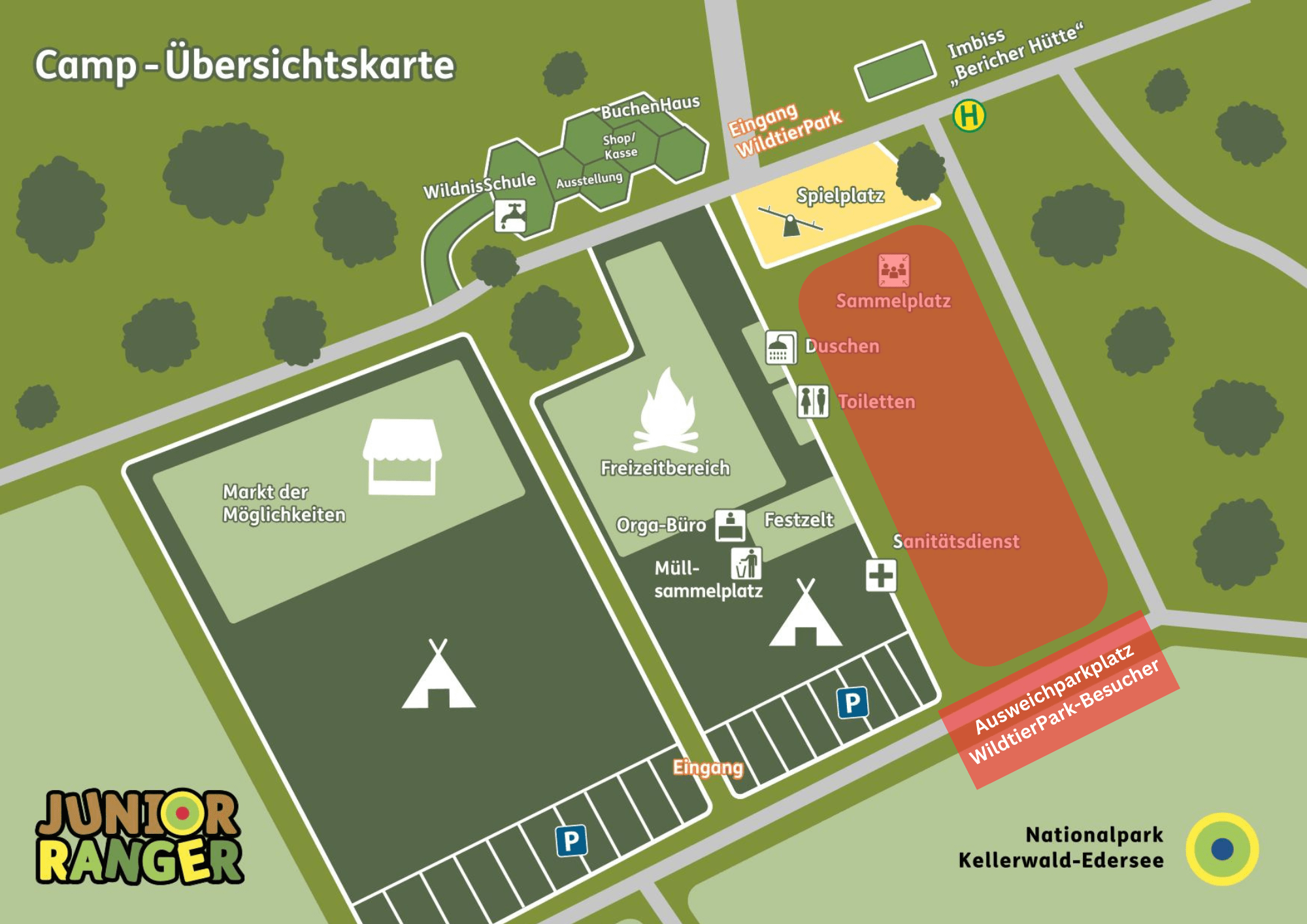 Edertal-Hemfurth. Junior Ranger aus 22 Großschutzgebieten des gesamten Bundesgebiets werden von Donnerstag, 15. Juni, bis Sonntag, 18. Juni, zu Gast im Nationalpark Kellerwald-Edersee sein, weshalb am WildtierPark Edersee mit großem Andrang und Engpässen bei den Parkplätzen zu rechnen ist. Ihr Camp werden die rund 230 Kinder und Jugendliche mit ihren Betreuerinnen und Betreuern auf der Wiese vor dem BuchenHaus am WildtierPark Edersee in Edertal-Hemfurth aufschlagen. Die Veranstaltung dient dem Austausch zwischen den Junior Rangern und ist nicht für den allgemeinen Publikumsverkehr geöffnet. Während des viertägigen Bundesweiten Junior-Ranger-Treffens kann es am WildtierPark allerdings zu viel Andrang und vor allem hinsichtlich der Parksituation zu Engpässen kommen. Deshalb möchte die Nationalparkverwaltung im Vorfeld Gäste des WildtierParks um Verständnis für eventuelle Beeinträchtigungen während ihres Besuchs bitten. Der reguläre Parkplatz des WildtierParks steht zwar uneingeschränkt zur Verfügung, der Ausweichparkplatz wird aber zu einem großen Teil durch das Camp belegt sein. Lediglich der Bereich unterhalb des Spielplatzes steht den WildtierPark-Besuchern weiterhin als Ausweichparkplatz zur Verfügung (siehe Lageplan). Darüber hinaus gilt für Fahrzeuge ein Tempolimit von 30 km/h auf der Zufahrtstraße zum WildtierPark.
