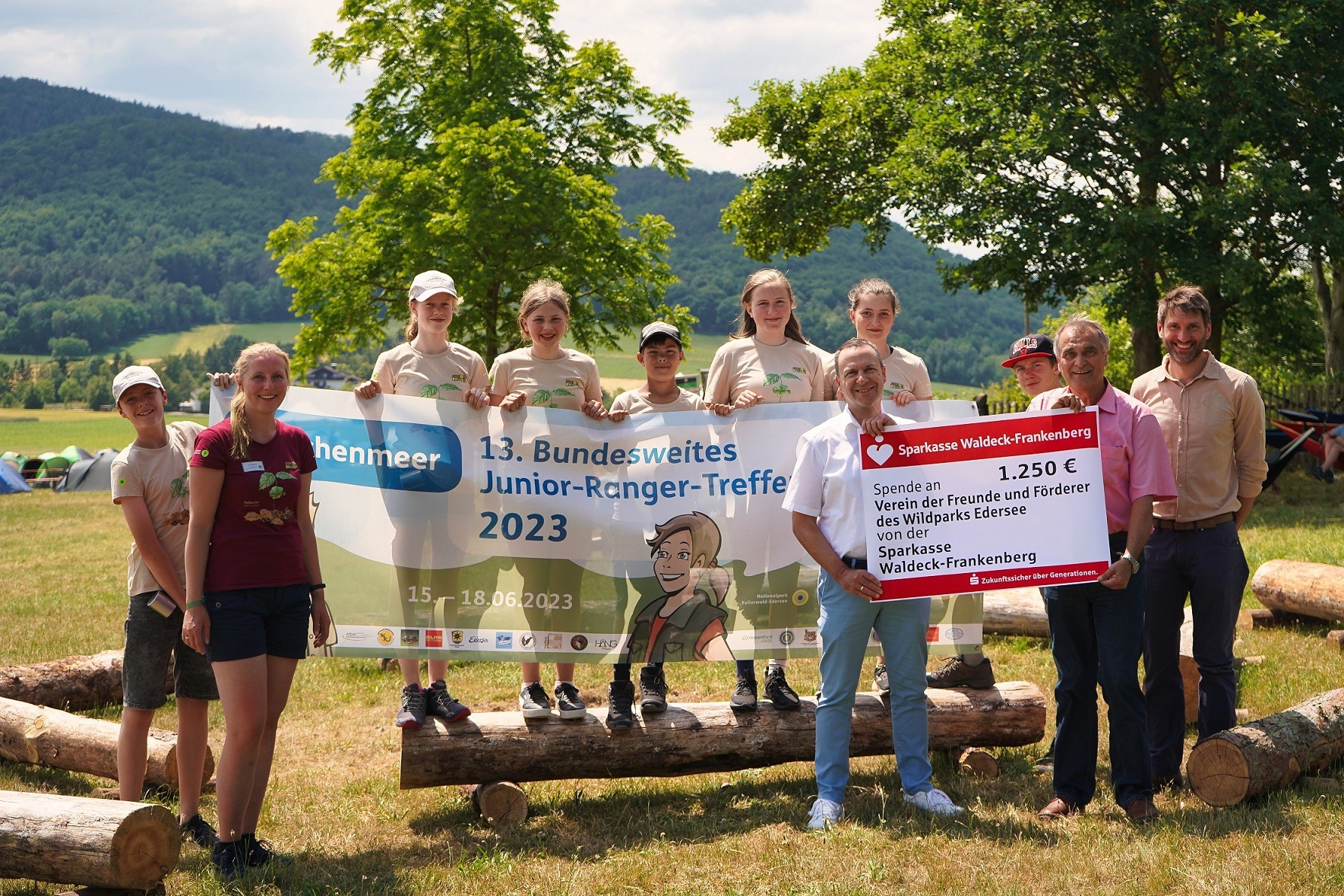 Edertal-Hemfurth. Die Sparkasse Waldeck-Frankenberg hat dem Förderverein für den WildtierPark Edersee e.V. am vergangenen Freitag einen Spendenscheck über 1.250 Euro für das Bundesweite Junior-Ranger-Treffen übergeben. Der Förderverein bezahlt mit der Spendensumme unter anderem den Besuch eines Falkners, der die Junior Ranger an einer der Rallye-Stationen im Nationalpark mit echten Greifvögeln überrascht hat. „Wer Natur liebt, fördert sie. Wir fördern gerne diejenigen, die die Natur den Besuchern in unserem Landkreis näherbringen. Die Junior Ranger sind die zukünftigen Multiplikatoren, die die Natur bewahren und ihr Wissen weitertragen“, sagte Ralf Lange von der Sparkasse Waldeck-Frankenberg bei der Scheckübergabe auf dem Camp-Gelände am WildtierPark Edersee. Am Bundesweiten Junior-Ranger-Treffen haben rund 230 Kinder und Jugendliche aus 22 Großschutzgebieten des gesamten Bundesgebiets teilgenommen. Ein Teil der Junior Ranger des Nationalparks Kellerwald-Edersee war bei der Spendenübergabe dabei. Neben ihnen freuten sich über die Spendensumme auch Klaus Gier als Vorsitzender des Fördervereins, Nationalparkleiter Manuel Schweiger und Stefanie Schaub, die die Veranstaltung federführend organisiert hat. „Das Bundesweite Junior-Ranger-Treffen bei uns im Nationalpark Kellerwald-Edersee ausrichten zu dürfen, ermöglicht uns, den Junior Rangern aus den anderen Bundesländern die Besonderheiten unseres Schutzgebietes näherzubringen“, sagt Schaub. „Dafür finanzielle Unterstützung von Unternehmen aus der Region wie der Sparkasse Waldeck-Frankenberg zu bekommen, freut uns sehr.“