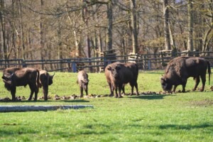 Hintergrund: Der Wisent oder Europäische Bison ist eine der beiden ursprünglich in ganz Europa vorkommenden Wildrinderarten. Während der Auerochse, die Wildform der meisten Rinderrassen, unwiederbringlich ausgerottet wurde, konnte der Wisent überleben. Wisente kamen noch bis in das frühe Mittelalter in den Urwäldern von West-, Zentral- und Südosteuropa vor. Ihr ursprünglicher Lebensraum sind die großen mitteleuropäischen Urwälder. Diese waren von offenen und halboffenen Weideflächen unterbrochen. Zu Beginn der ersten Rodungsphasen im Frühmittelalter zogen sich die Wisente deshalb vermutlich aus etlichen Gebieten West- und Mitteleuropas schrittweise zurück. Durch die Verfolgung als Jagdbeute oder als Konkurrenz zur Viehhaltung starben die verbliebenen Wisente aus. Um das Jahr 800 n. Chr. war der Wisent dann westlich des Rheins vermutlich ausgerottet. Circa 200 Jahre später auch westlich der Elbe und im Spätmittelalter (um das Jahr 1364) soll der letzte Wisent westlich der Weichsel erlegt worden sein. In Osteuropa und im Kaukasus hielten sie sich bis in die Neuzeit, bis sie dann schließlich in freier Wildbahn auch dort ausstarben und nur noch in Tiergärten und Zoos überlebten.