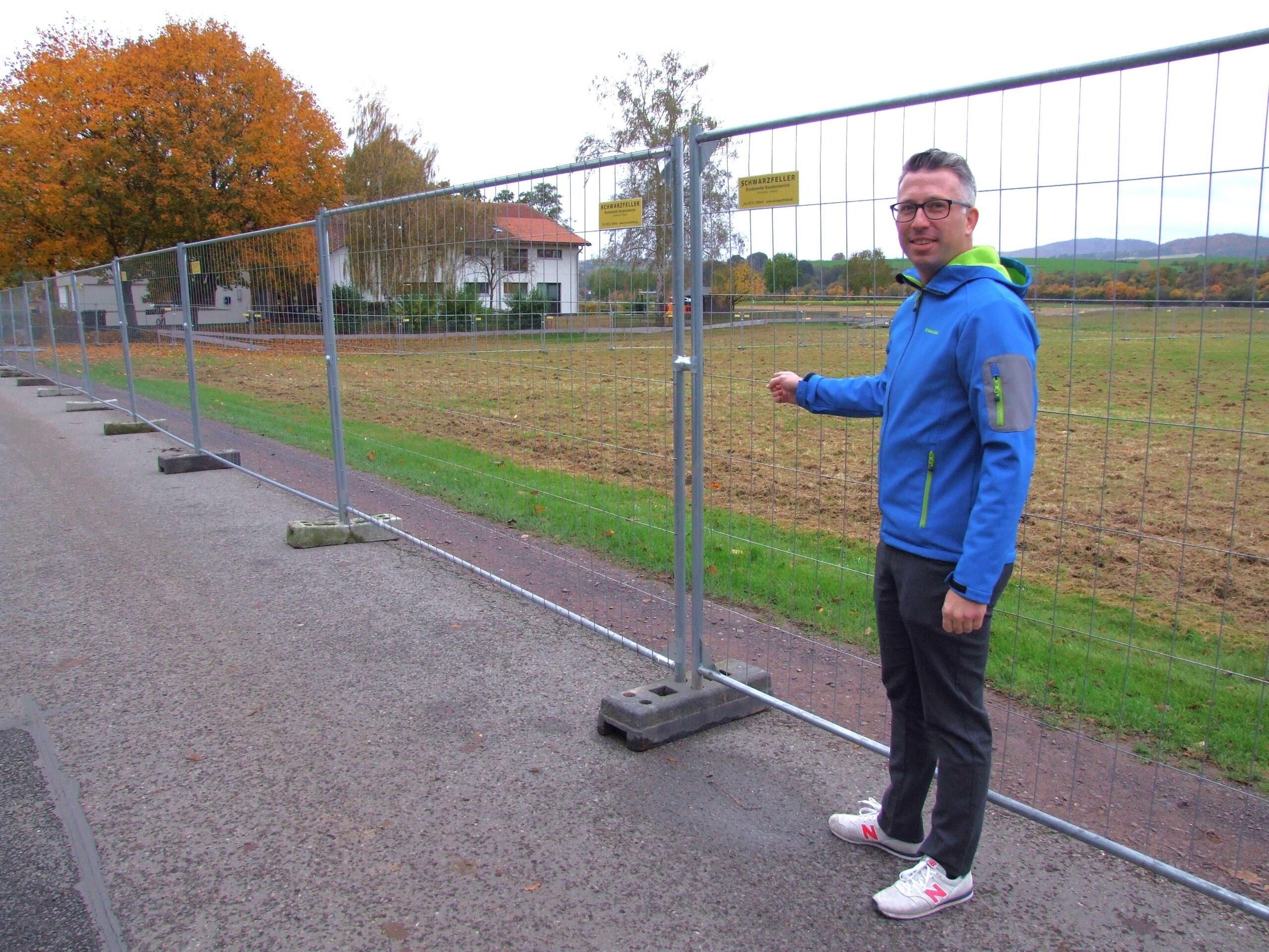 Der Bauzaun steht schon: Bauamtsleiter Alexander Paul zeigt auf die Wiesenfläche neben dem Kindergarten in Bergheim. Hier soll im Auftrag der Nationalparkgemeinde Edertal in den kommenden Monaten ein Bikepark mit Rastparkplatz, Kletter- und Spielgeräten entstehen. (Foto: Klein)