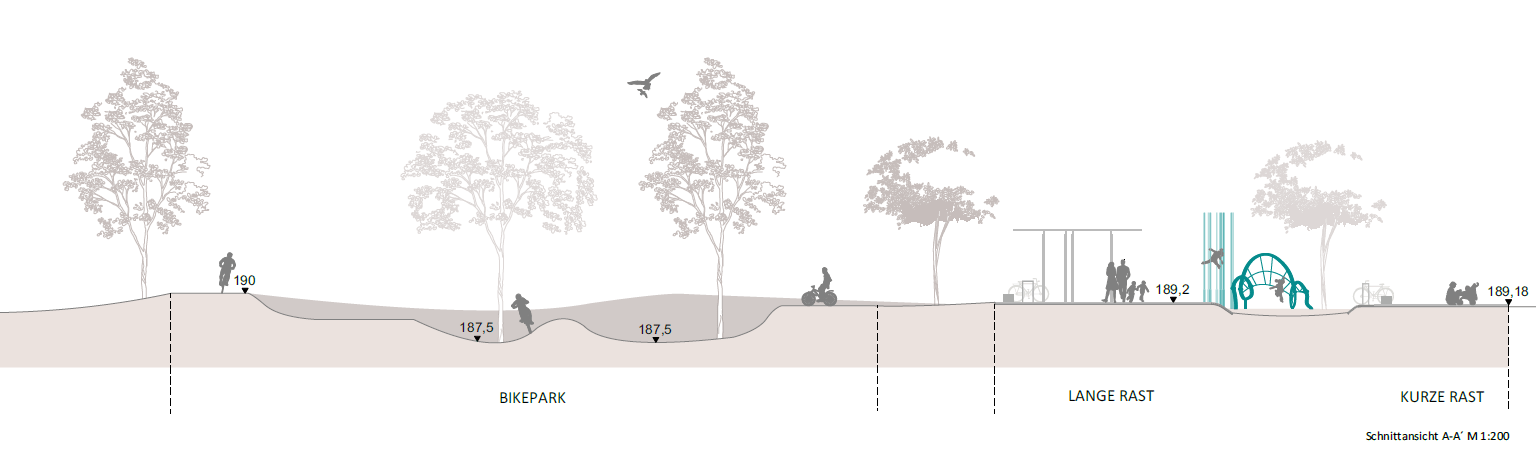 Über Höhen und Tiefen: Die Schnittzeichnung zeigt die Geländeform des Bikeparks in den Ederauen bei Bergheim. (Grafik: Landschaftsarchitekturbüro Schöne Aussichten)