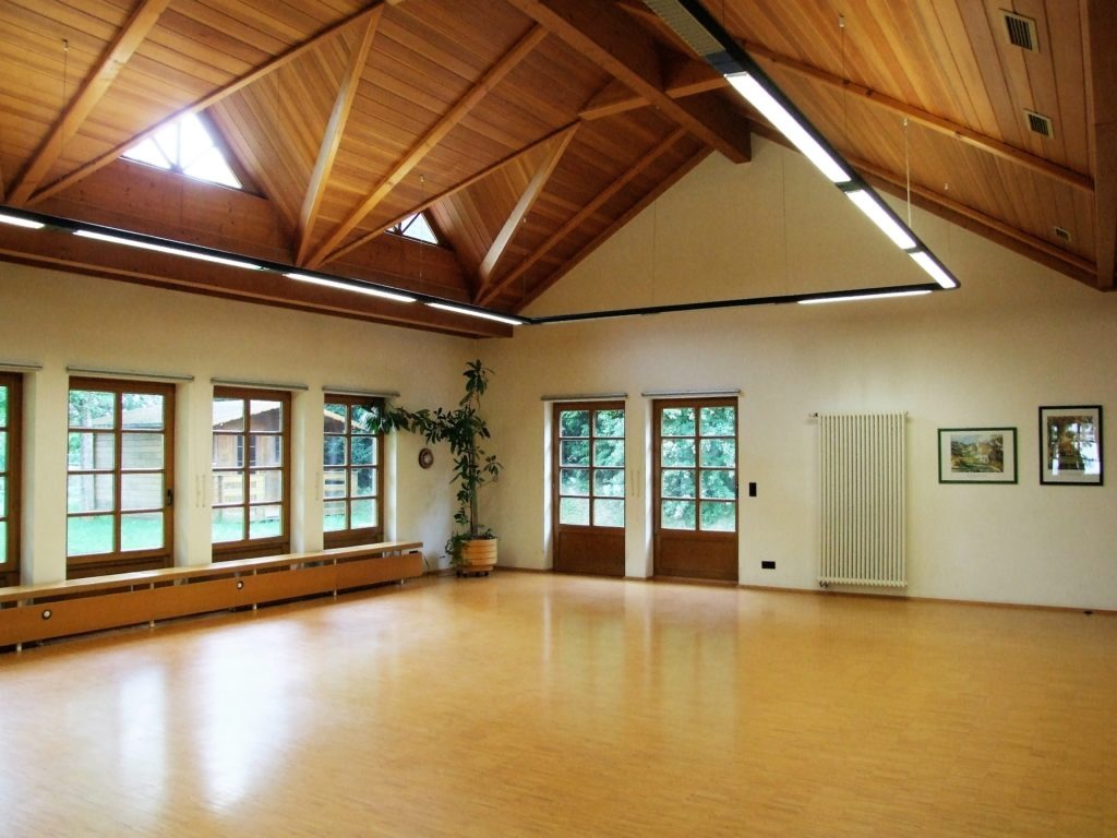 Durch Öffnen einer Trennwand kann die Raumkapazität des Veranstaltungs- oder Festsaals auf etwa 120 Sitzplätze erweitert werden.